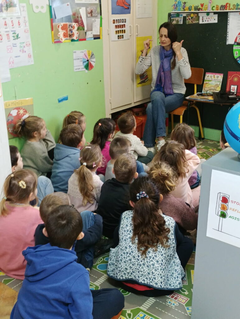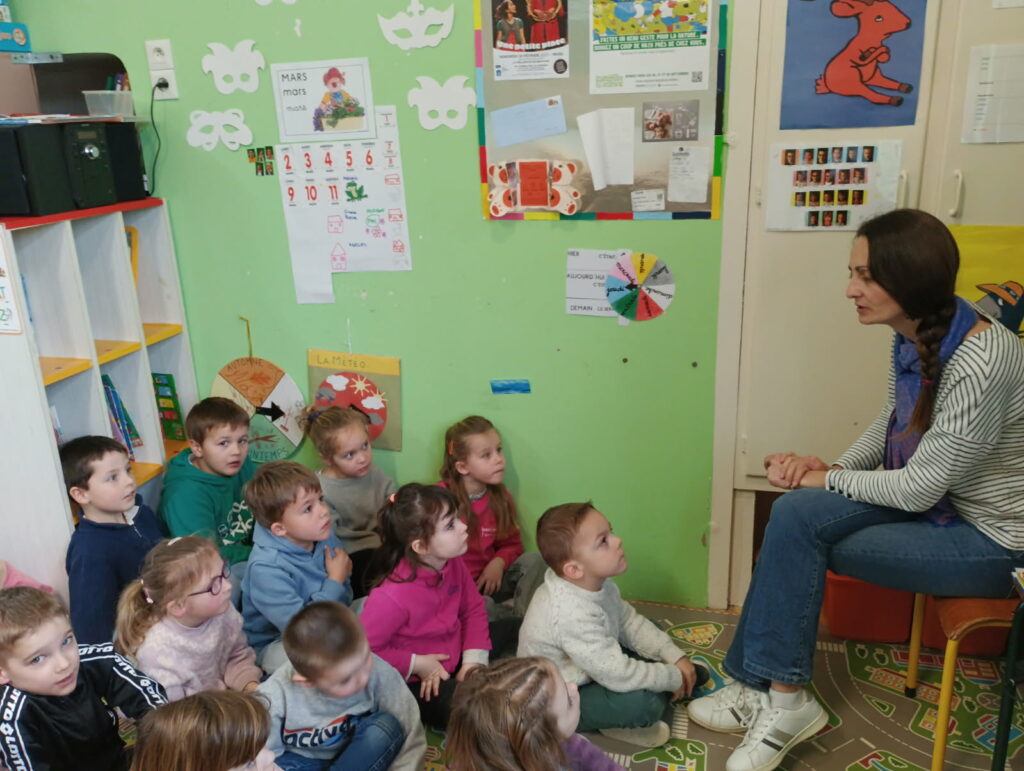 Jeudi les élèves de mater-cp ont une séance d’anglais avec Marie (pendant qu’Isabelle monte faire les arts visuels avec les CE-CM).