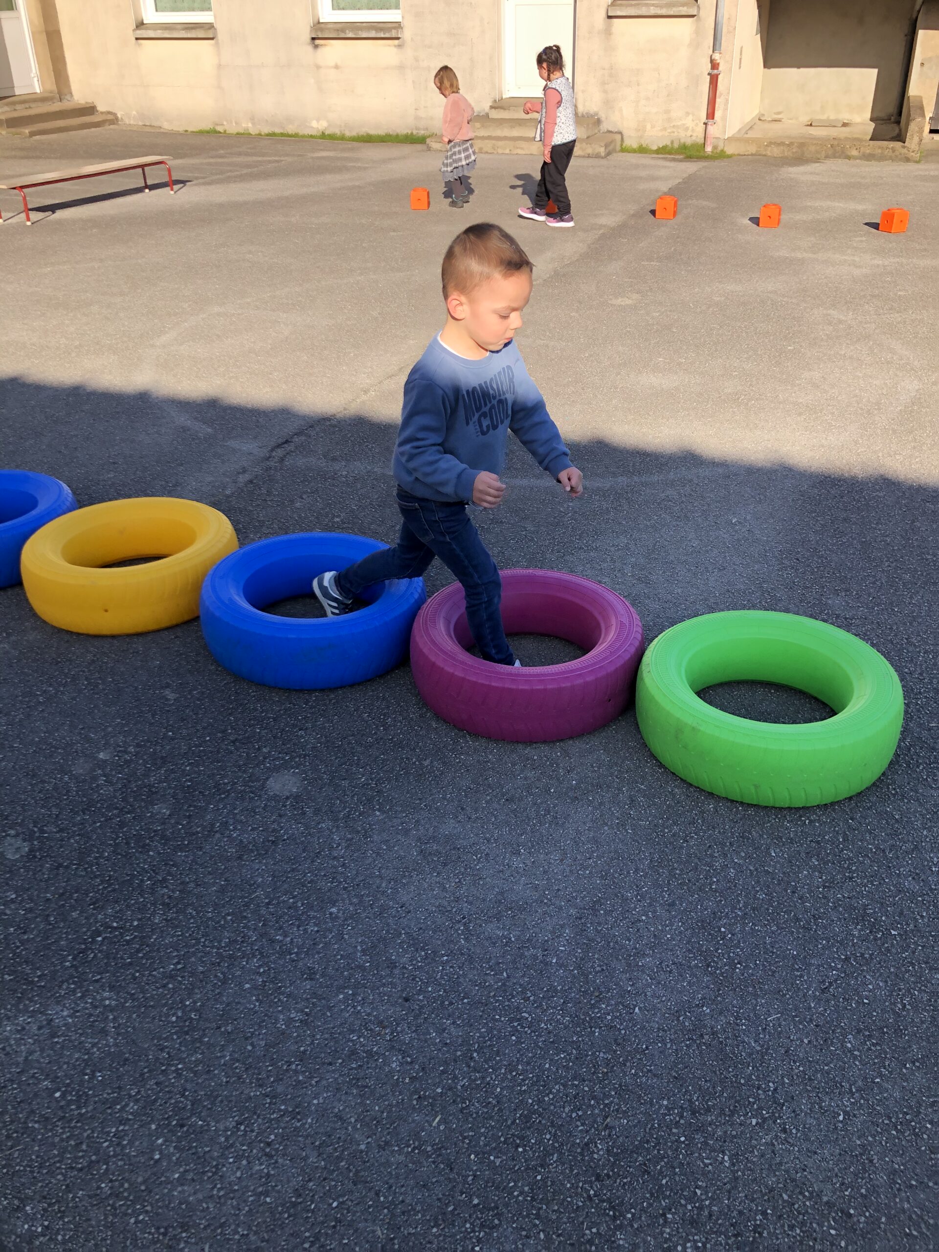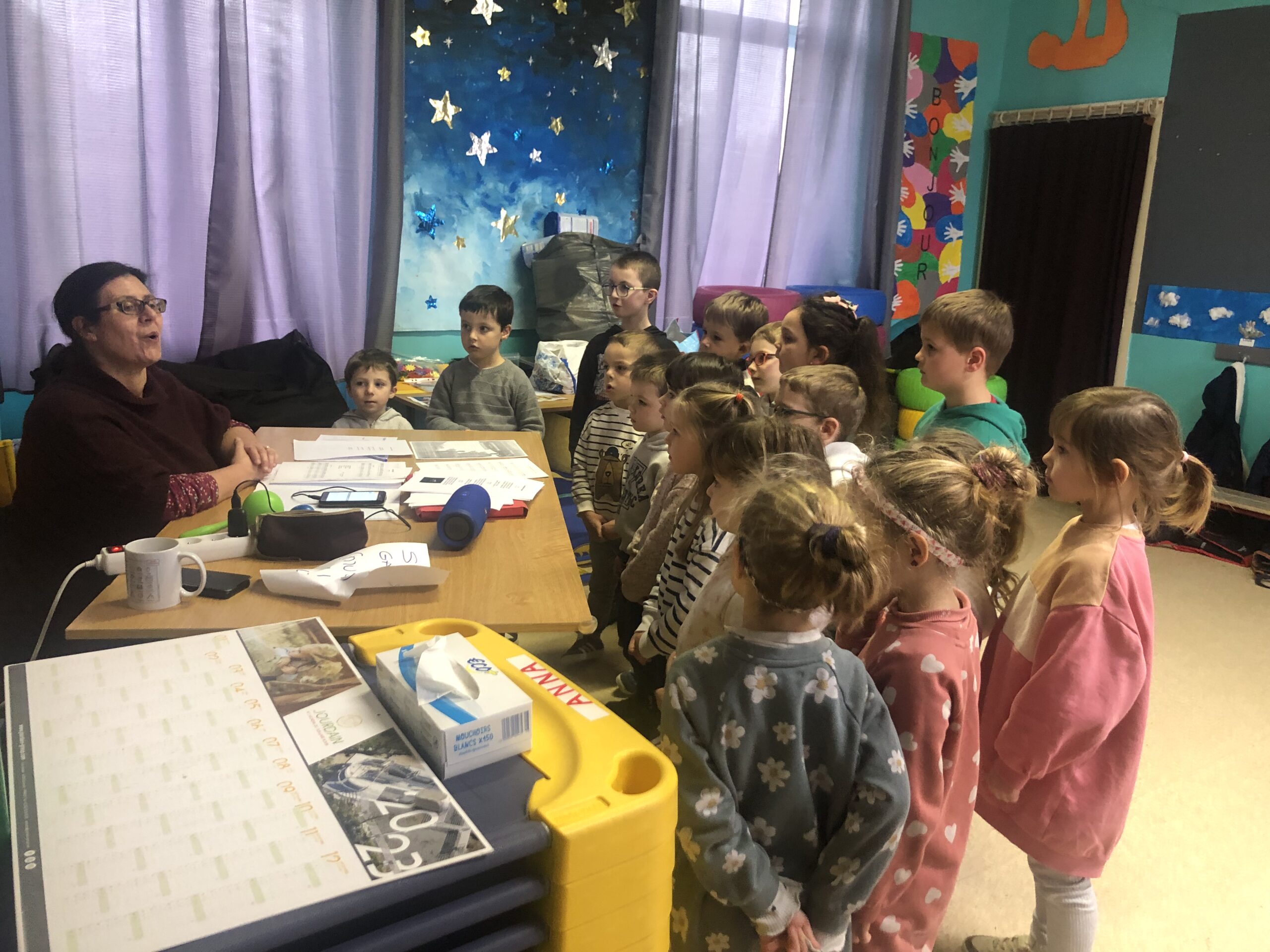 Jeudi les élèves de mater-cp ont une séance d’anglais avec Marie (pendant qu’Isabelle monte faire les arts visuels avec les CE-CM). Après avoir mémorisé les couleurs en anglais, les enfants apprennent progressivement à se présenter : se nommer, dire son âge, dire son émotion du moment…