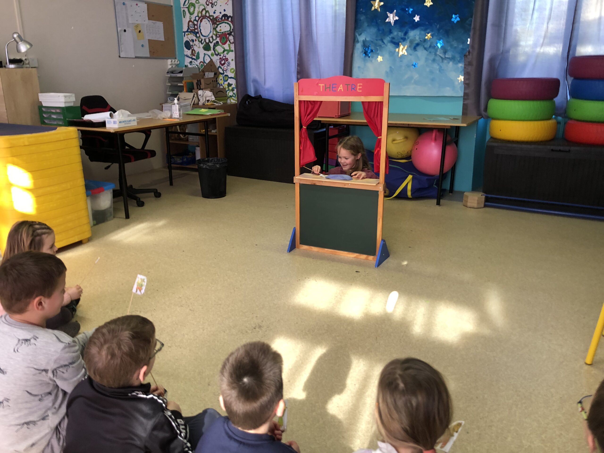 Tous les lundis fin de matinée, les élèves de mater-CP participent à 3 ateliers de langage successifs. Un atelier porté sur la précision du vocabulaire avec Marie D selon un thème précis Un atelier porté sur la construction des phrases au travers d’un jeu avec Emmanuelle Un atelier théâtre avec Isabelle (petites scénettes)