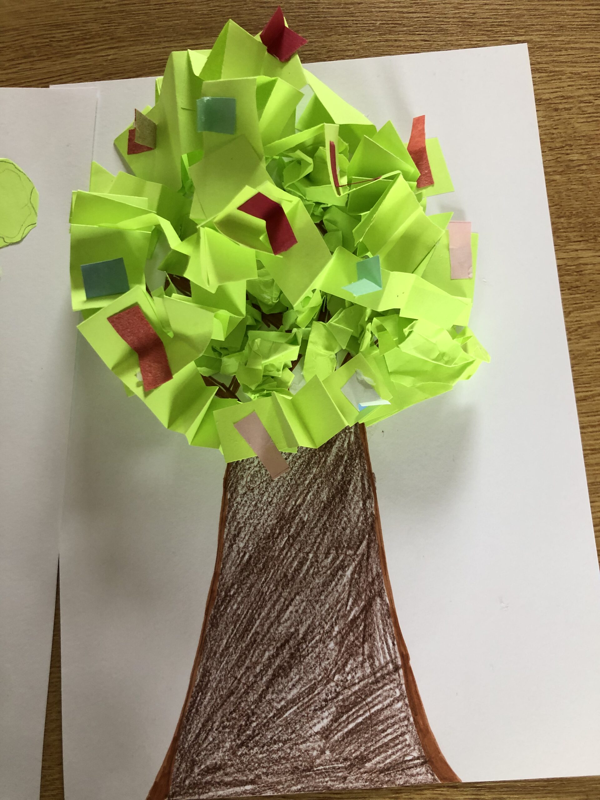 Les élèves de CE-CM ont travaillé le thème du relief. Consigne : faire un arbre de printemps avec le feuillage en relief… Plusieurs actions différentes avec le papier ont été utilisées par les élèves : plier, froisser, superposer, courber, surélever… pour donner du volume à leur oeuvre.
